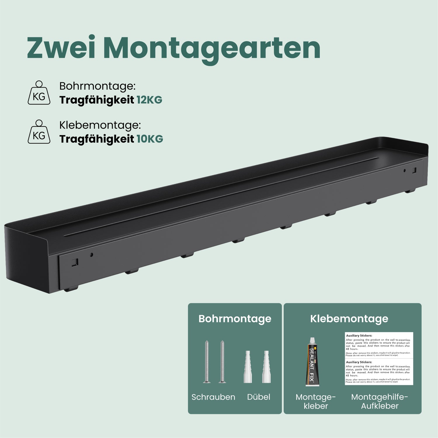 - Flexible und einfache Montage: Wahlweise Klebemontage (bis zu 10 kg Tragkraft) oder Bohrmontage (bis zu 12 kg Tragkraft). Alle benötigten Montagematerialien, einschließlich starkem Spezialkleber, sind im Lieferumfang enthalten.