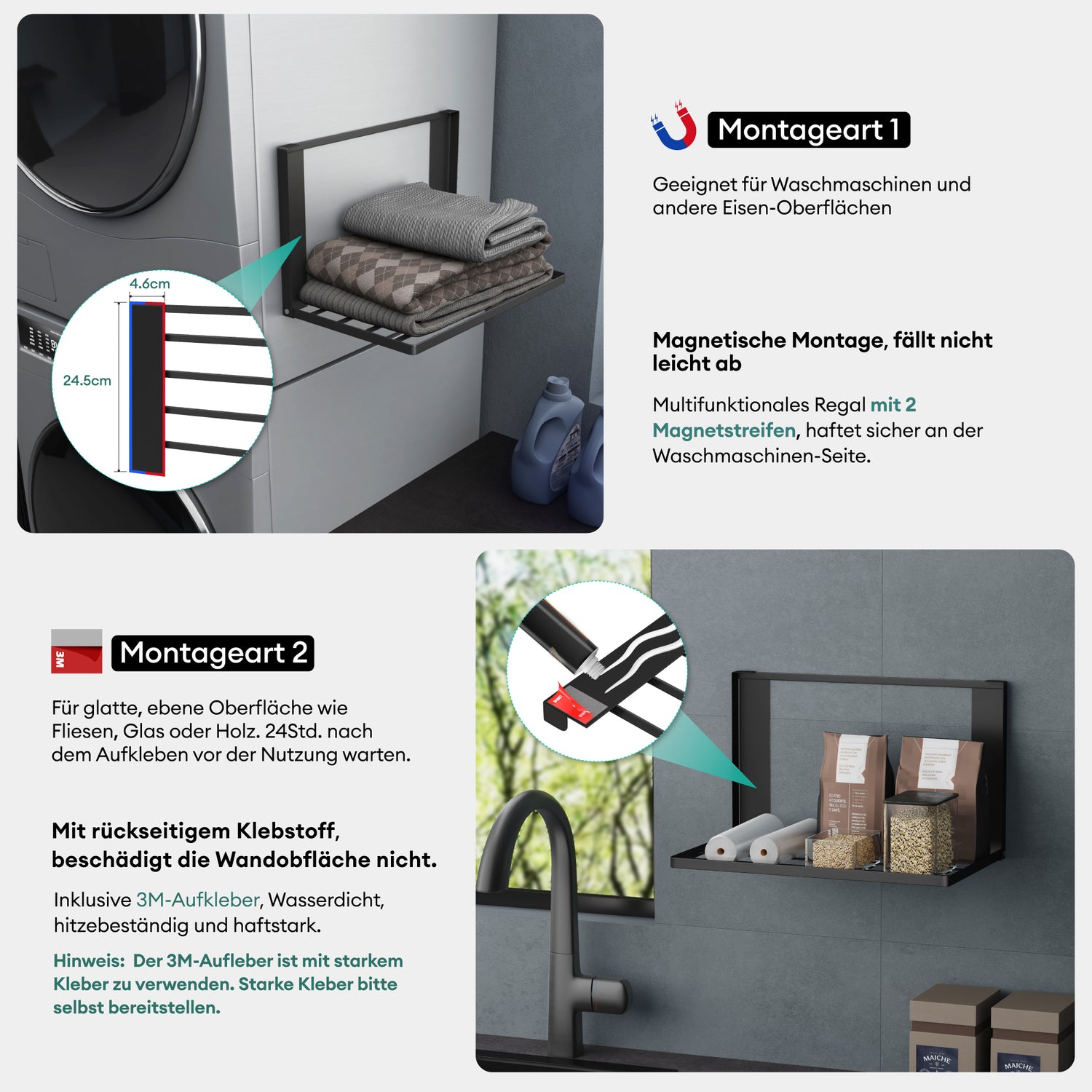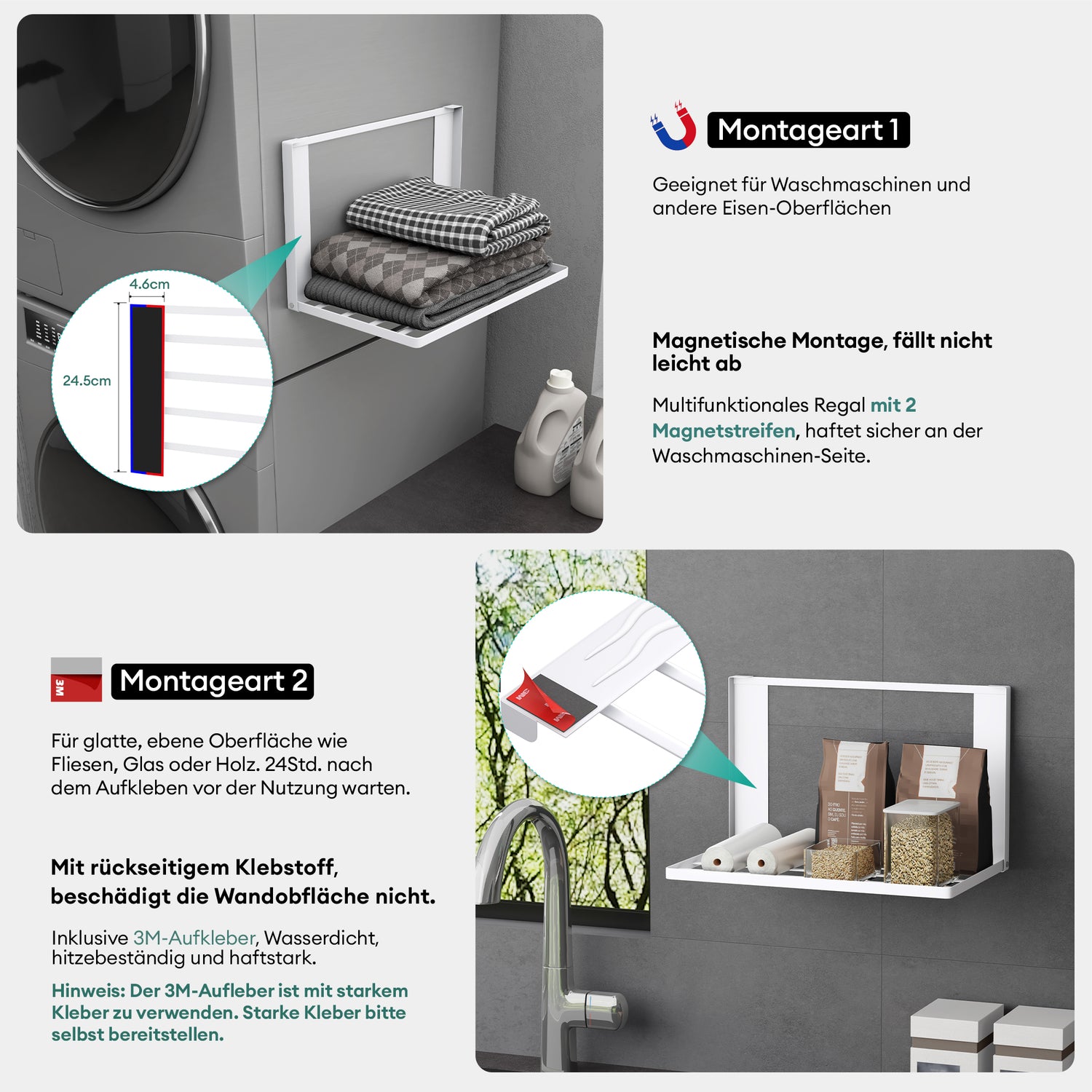 - Zwei Montagearten: Magnetische Befestigung für Waschmaschinen und Eisenoberflächen oder mit rückseitigem Klebstoff für glatte Fliesen, Glas oder Holz – flexibel für verschiedene Wandtypen